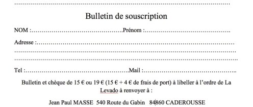 La souscription touche à sa fin. Si vous ne l’avez pas encore fait, hâtez-vous d’imprimer ou copier le bulletin ci-dessous, le remplir et l’envoyer à Jean-Paul Masse 540 route du Gabin 84860 CADEROUSSE …
