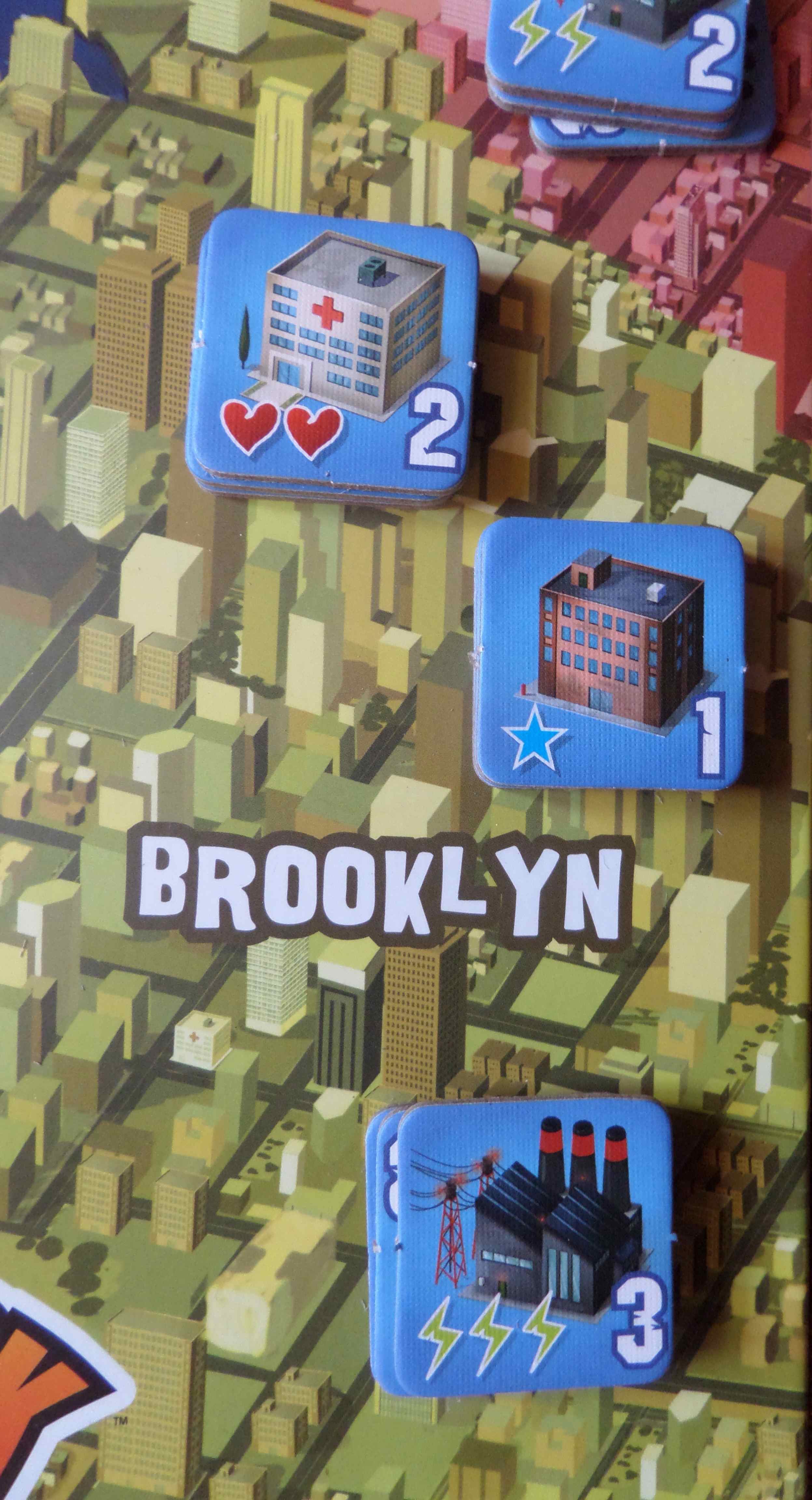 En faisant 2 destructions, le monstre positionné à Brooklyn pourra détruire l’hôpital ce qui le soignera de 2 blessures. Avec 1, il pourra détruire l’immeuble central ce qui lui rapportera 1 point de victoire… Mais les immeubles détruits ne sont pas retirés. On retourne le pion ce qui fait apparaître des armées…