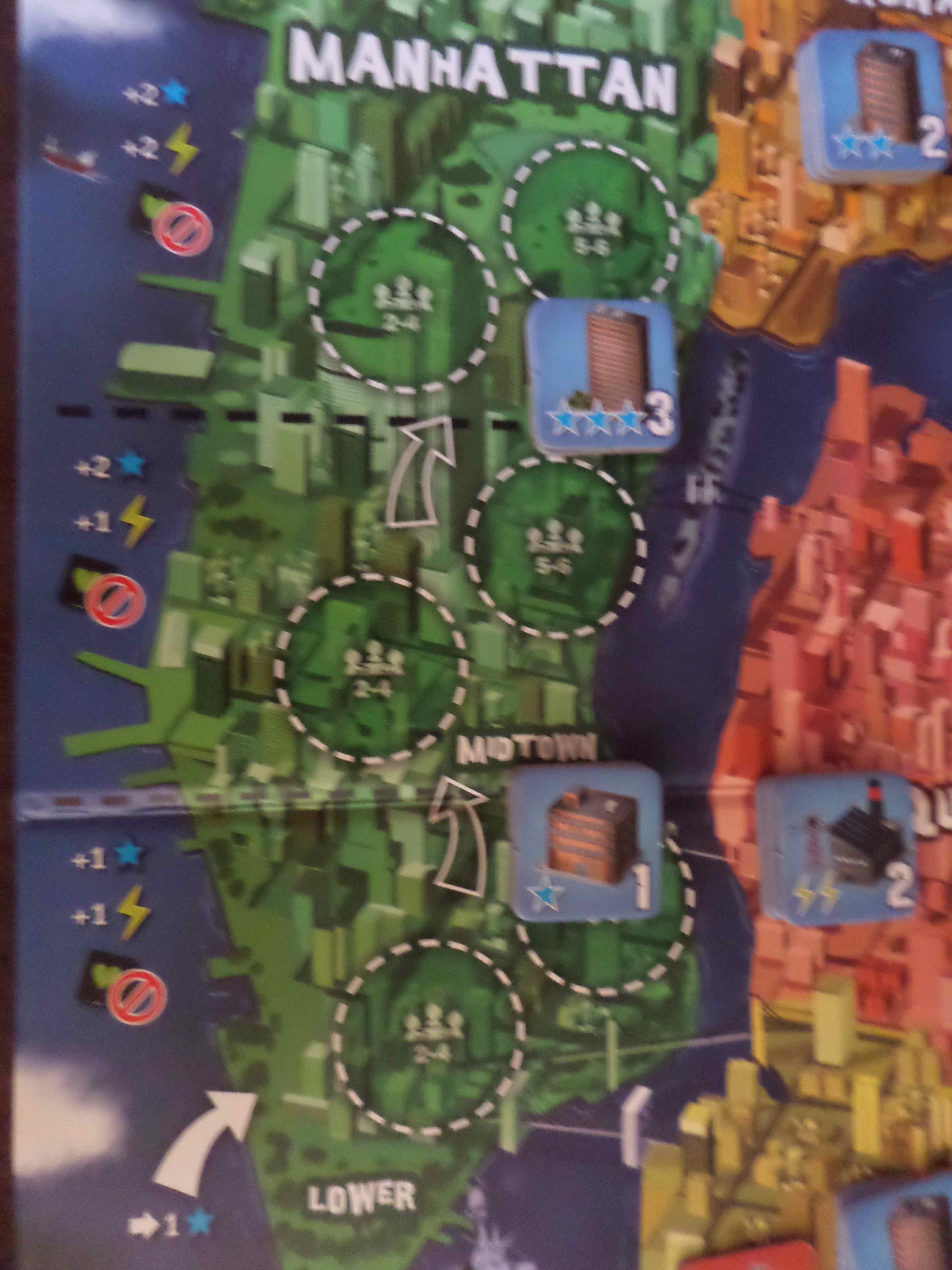 Quand un monstre entre à Manhattan, il gagne un point de victoire et se place tout en bas. Au bout d’un tour, il gagne 2 points de victoire et 1 énergie mais doit monter dans le secteur médian où il gagnera 2 points de victoire et 1 énergie au bout d’un tour mais devra monter au secteur haut… Mais il ne faut pas rêver, il y a longtemps qu’il se sera retiré car on ne peut se soigner à Manhattan comme à Tokyo, sinon en détruisant des hôpitaux !