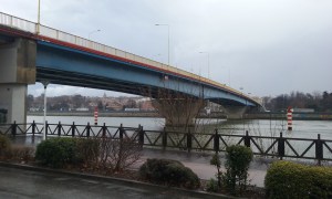Le nouveau pont vu depuis le port fluvial de Valence le long duquel ont accosté un toueur et des barques. Sur ce bel espace qui pourrait être le prolongement du jardin public, les décideurs ont eu la très mauvaise idée de faire passer l’autoroute A7, coupant la ville du fleuve et privant les Valentinois des plaisirs de promenades au bord de l’eau.