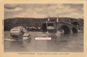 Pour terminer, une vue du pont suspendu provisoire jeté sur le Rhône en remplacement du pont de pierre dynamité par le Génie français en 1940 puis à nouveau endommagé par les sapeurs allemands pour protéger la fuite des unités remontant la vallée du Rhône après le débarquement du 15 août 1944 en Provence.