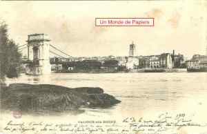 Les constructions ne sont pas encore là ni les voies de communication et la pile trône seule au milieu de nulle part, en bordure du Rhône. Elle en est presque l’alter-ego du clocher de la cathédrale de Valence sur la rive gauche. On remarque que la pile de ce côté-là a déjà disparu. A l’emplacement de la clinique Pasteur, on remarque les jardins des Granges.
