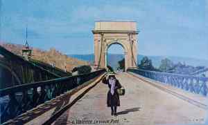 La jeune fille pose devant l’objectif du photographe au milieu du pont suspendu. Au fond le rocher de Crussol.