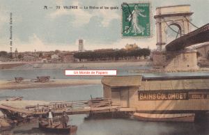 Les constructions ne sont pas encore là ni les voies de communication et la pile trône seule au milieu de nulle part, en bordure du Rhône. Elle en est presque l’alter-ego du clocher de la cathédrale de Valence sur la rive gauche. On remarque que la pile de ce côté-là a déjà disparu. A l’emplacement de la clinique Pasteur, on remarque les jardins des Granges.