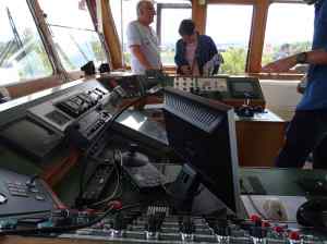 L’an dernier, on n’avait pu entrer et on avait écouté les explications sous le bruine et le mistral sur la digue du canal. Cette année, le temps n’est guère plus clément mais le public est accueilli par la proviseure, deux professeurs et un élève dans les parties les plus intéressantes de ce bateau qui forme les nouveaux mariniers du Rhône du XXIème siècle.