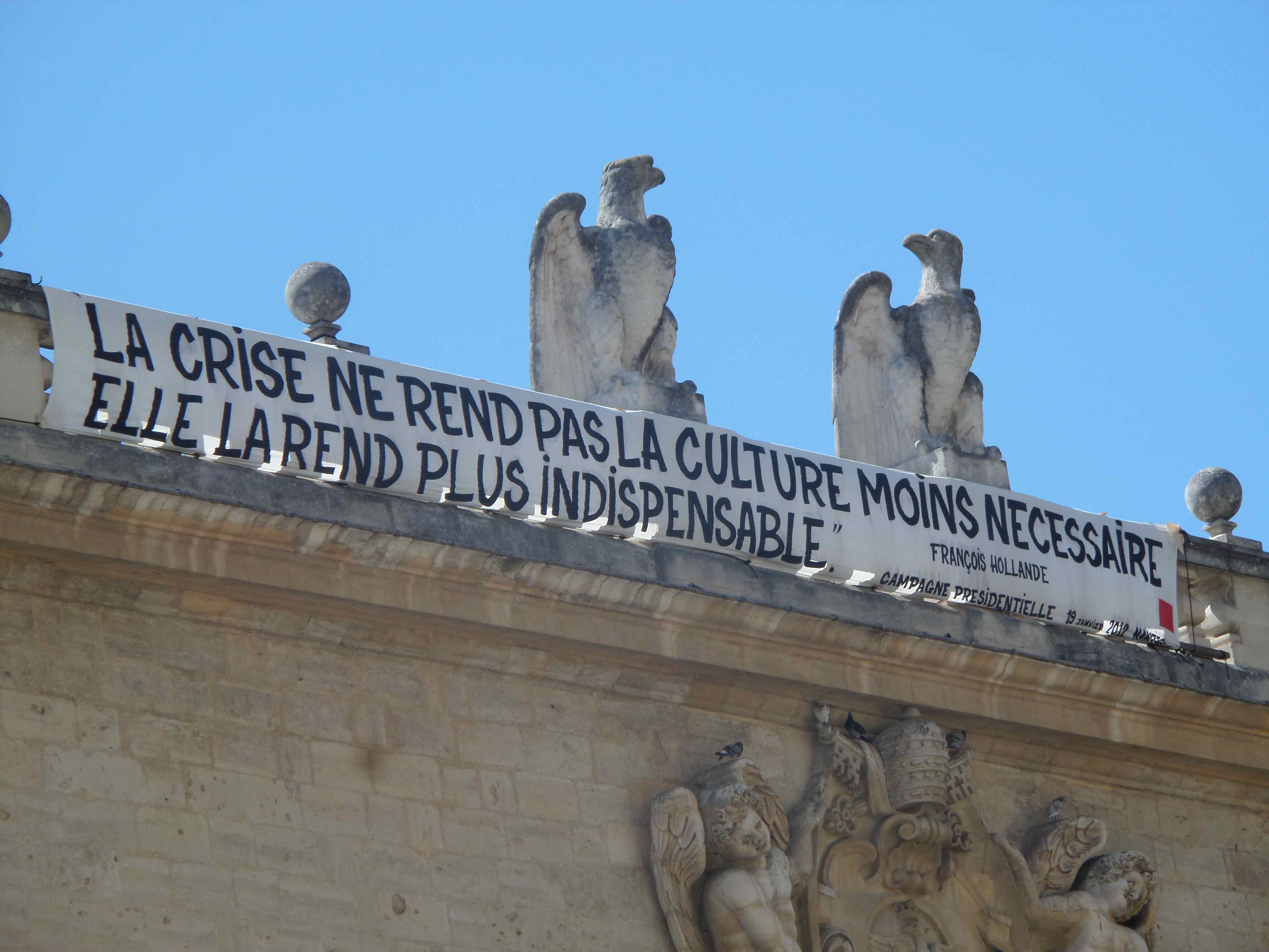 Et dehors, face au Palais de Papes, les intermittents du spectacle en lutte rappellent au Président ce qu’il déclarait il y a à peine plus de 2 ans!