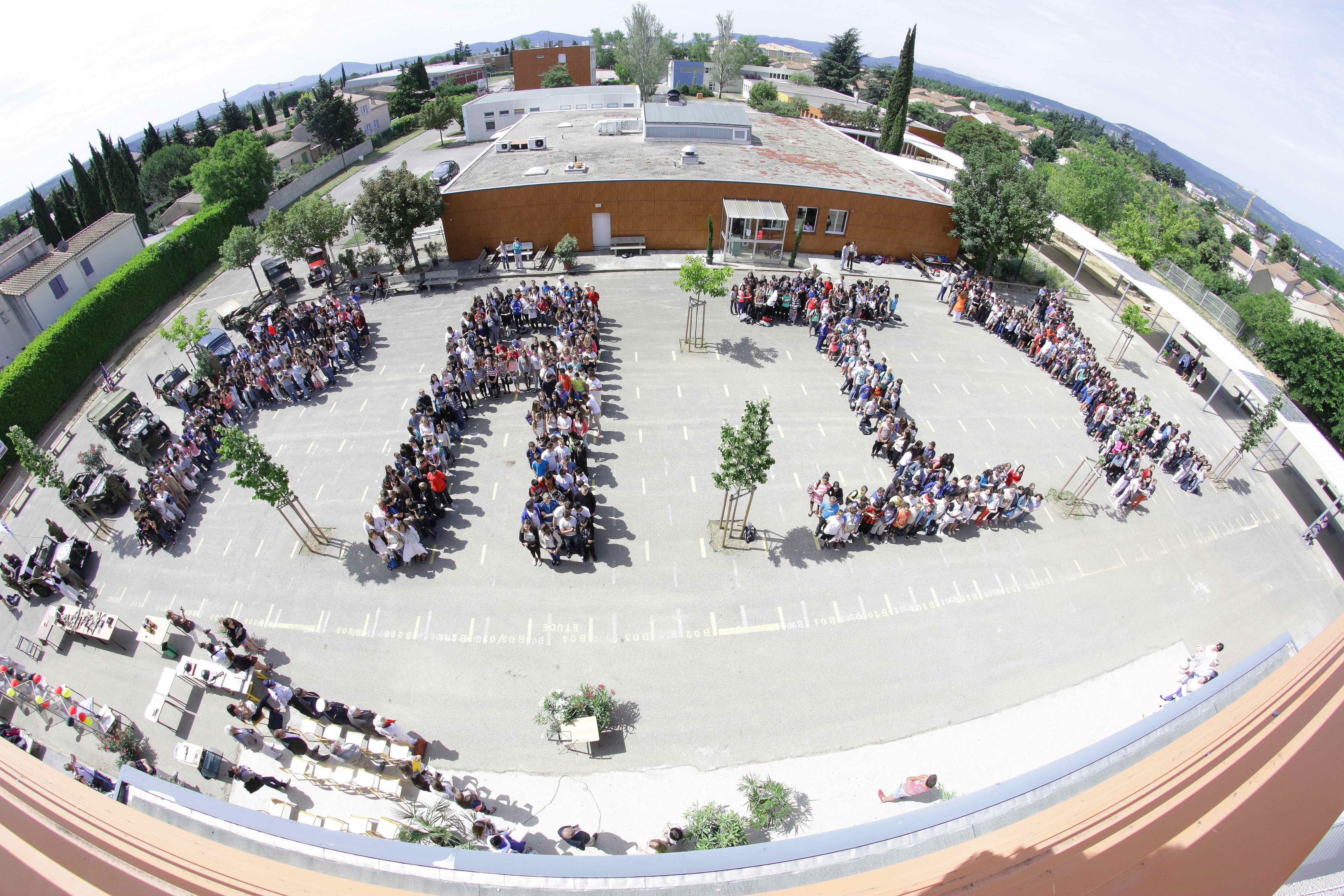 10/06/2014 La célébration du D-Day à Monod (suite) Une dernière photo de cette manifestation avec le mot PAIX géant réalisé dans la cour par les 700 élèves de l’établissement. Impressionnant!
